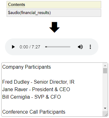When you are finished, stow the specification under the desired name. Rendering the Audio TagAudio tags are rendered using the $audio function. Let's suppose the above specification was stowed under the name financial_results, we could render this component within the tags model using the following dollar function.