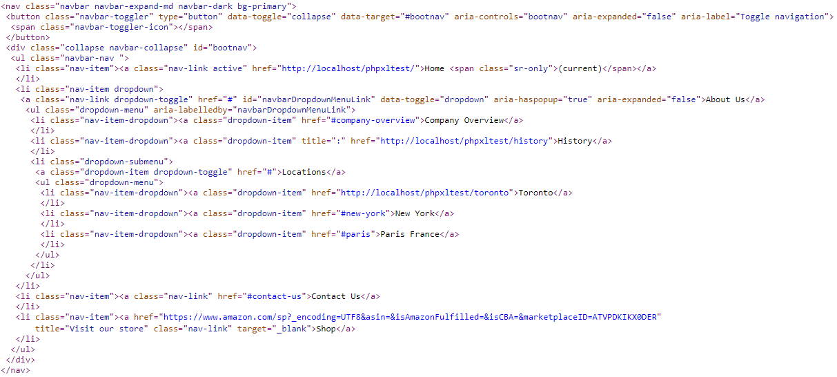 When translating pages defined using $anchor, the translation class can be defined as a property of the anchor. If you such property is found, the class is assumed to be anchor. Translating List HeadingsList headings that begin with the internationalization escape character will be treated as pointers to translation classes. These can either be fully qualified as in :class->variable or they can just contain the variable name as in :variable. If they only contain the variable name the translation class is assumed to be the same as the menu id. Adding Bootstrap Styles and ScriptBootstrap needs a number of style and script files to be defined in order to use the built-in Bootstrap features. Since most of the pages of your site have a menu, the GenHelm framework automatically adds the necessary styles and script if it detects that these have not been added manually. Specifically, the bootstrap package will be added to pages that include a reference to the $bootnav function. The bootstrap styles and scripts are served from a CDN (Content Delivery Network). It is also possible to host one or more of these files on your own site. You would need to do this if you plan to make changes to the default files. If hosting these files on your site, you must update the bootstrap package and change the references to point to your local script and css files. Styling Your NavbarBefore styling your navbar it is a good idea to become familiar with Bootstrap 5 Navbar. The bootnav model seeks to implement all of the features offered by the Bootstrap navbar. The easiest way to learn about these features is to try them and look at the rendered output. Refer to the popup help for each of the bootnav specification fields to learn how the fields are used. |
