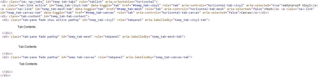 Tab IdThe tab id refers to the unique identifier that will be associated with the tab. This should only contain lowercase letters and number as well as underscores or dashes. LabelThe label text will be shown on the tab as anchor text. If left blank, the label text will be defaulted by converting the Tab Id into words by changing underscores and dashes to spaces and making each word title case. CSS ClassThis can be used to add one or more css class identifiers to style the tab content. Note that you are also able to set classes that apply to all tabs, this css class setting should only be used for classes that are specific to certain tabs. Tab ContentThe content of each tab can be entered directly as is shown on the canvas tab above or it can reference other content using dollar functions. Static content can also be intermingled with dollar function content. Tab StylesThe Tab Style selector allows you to choose between normal (shown above), and Pill styles. Here we see an example of the Pill style tabs: