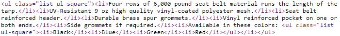 Referring to the List Items grid notice that list items can include $function references such as $link, $locale, etc. Rendering the ListLists are rendered by passing the list id to the $list function. Suppose the list above is called vinyl_tarp_benefits, the dollar function $list(vinyl_tarp_benefits) would render the following output: