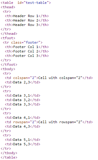 If you hover your cursor over a cell with a green indicator you will be shown the properties that have been assigned to the cell. Footer RowIf your table has a header row (generates a thead tag) it is also possible to define a footer row in order to generate a tfoot tag. This is done by adding a class named "footer" on row number 1 (the first data row below the header row). It is not necessary to define this class in your css unless you want to add special styling to the tfoot row. The footer row is always rendered as the last row of the table even though it is defined on row 1. If your table does not require a footer row, row 1 will be treated as a normal table row (provided class="footer" is not used on the row styling). |